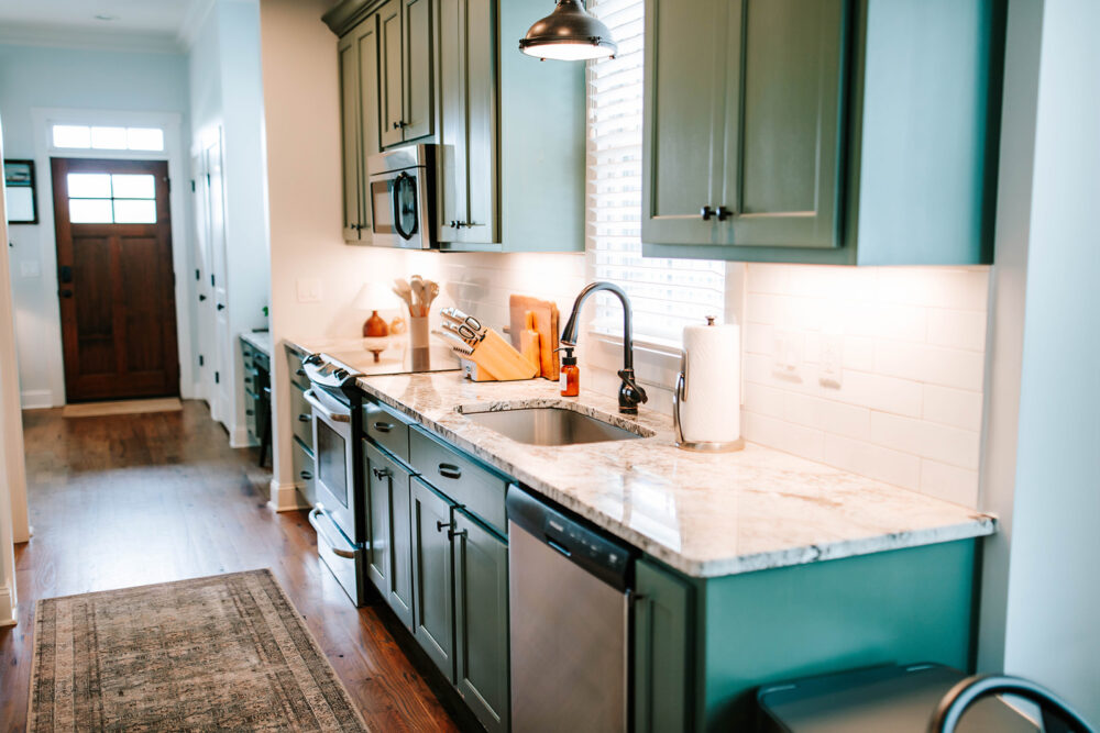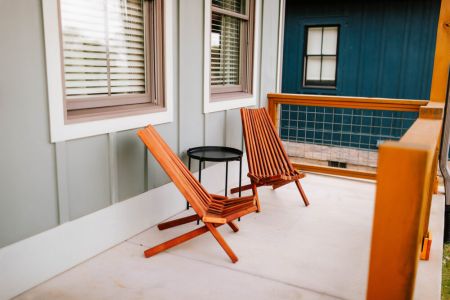 The modern galley style kitchen and dining area offer plenty of room to comfortably host intimate dinners and are outfitted with all the cookware, dishes, utensils, dishwasher pods, and appliances you will need to cook delicious meals. The inside dining table can seat up to four, and there is also dining seating for eight on the back porch.