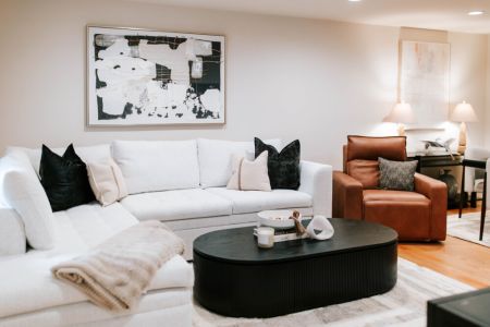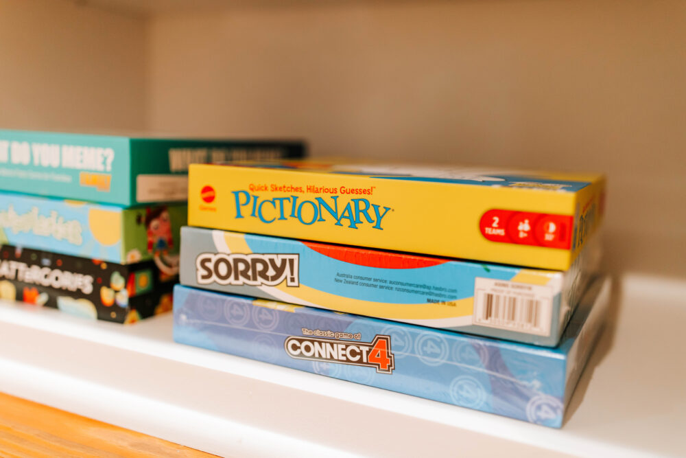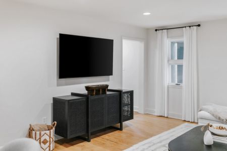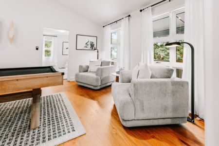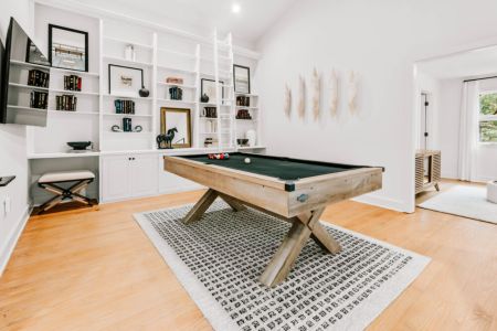 The main living room offers a comfortable sectional sofa, powered recliner, and a 65” smart TV—perfect for family movie nights. Downstairs, the game room provides a pool table, seating area, another 65” TV, and classic board games.