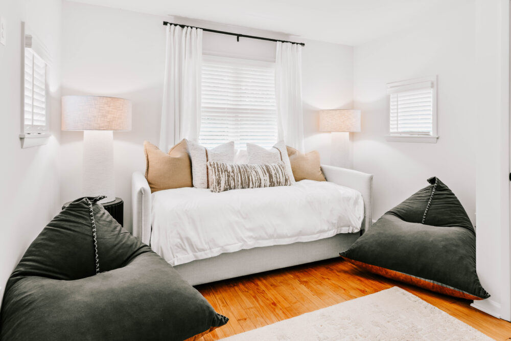 This retreat features three thoughtfully designed bedrooms to accommodate families and groups. The primary suite includes a king bed, the second bedroom has a queen, and the third offers a twin daybed with trundle. For added flexibility, the sectional sofa also doubles as a sleeper.